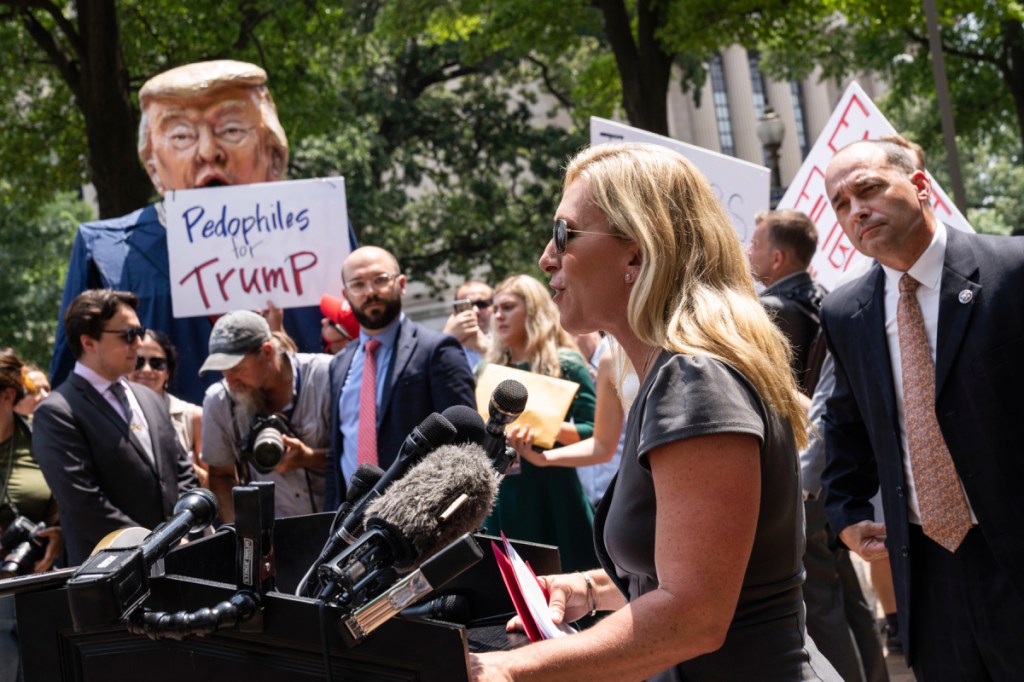 Reporters and cameramen set up in a classic line of battle, with them on one side and us on the other. It was like the Thanksgiving episode of WKRP in Cincinnati. “There is a helicopter overhead and it’s pulling a banner,” you just knew something was about to happen. Marge Failure Greene, who lost her committee assignments for being disruptive, complains because others are being disruptive. Matt Gaetz the man trying to silence claims of sex trafficking of minors, declares the protestors are trying silence him. I don’t want him silenced; I want him incarcerated. He can say whatever he likes from the Federal Penitentiary.